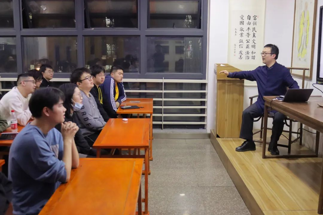 随后,甘霖老师介绍了吟诵的内容定义与历史涵韵,并示范吟诵了几段诗词,让我们体会到了吟诵文化的博大精深。他介绍了吟诵的规则,比如吟诵遵循依字行腔、依义行调、平长仄短、虚字韵长等。老师还强调了不仅要将诗文读得字正腔圆,还需要将内涵、意境、韵味传达得丰富、深刻。吟诵是具感性、审美化、艺术性、寓教于乐的读书法,掌握吟诵调在一定程度就掌握了中国文化内涵。