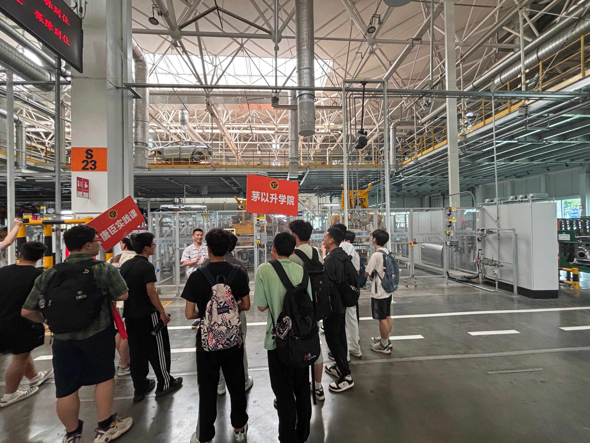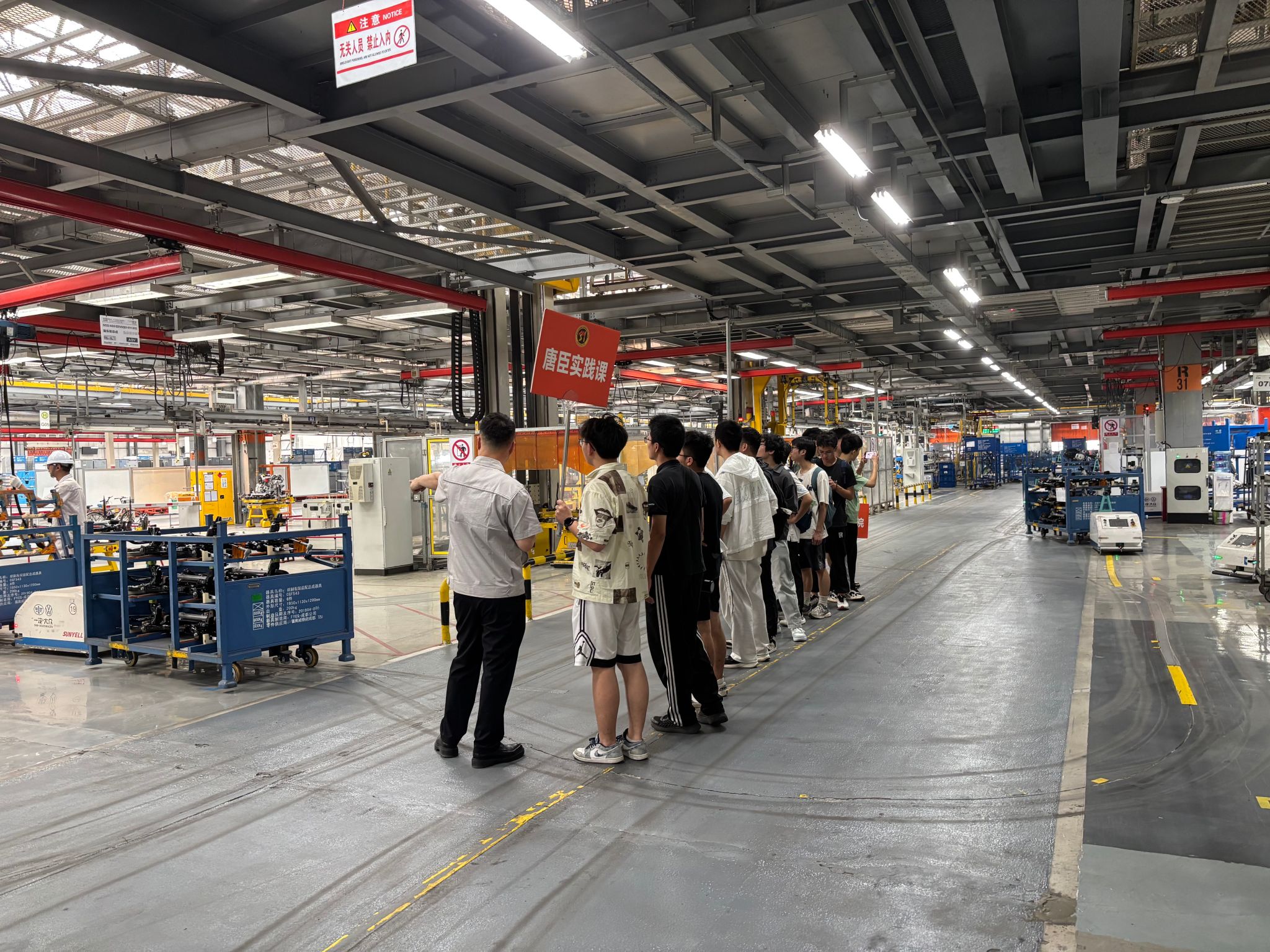 一汽-大众成都分公司总装车间校企合作负责人江济炜、总装工长兼研学研修负责人李屹伟引领同学们深度探访捷达工厂,在捷达大楼、焊装车间、总装车间、精益长廊,零距离了解一辆汽车从组件、安装到检测的诞生全过程,沉浸式感受智能制造的魅力。同学们在生产现场听取了关于生产全要素数字化管理系统现状、问题及其改进方法的介绍。