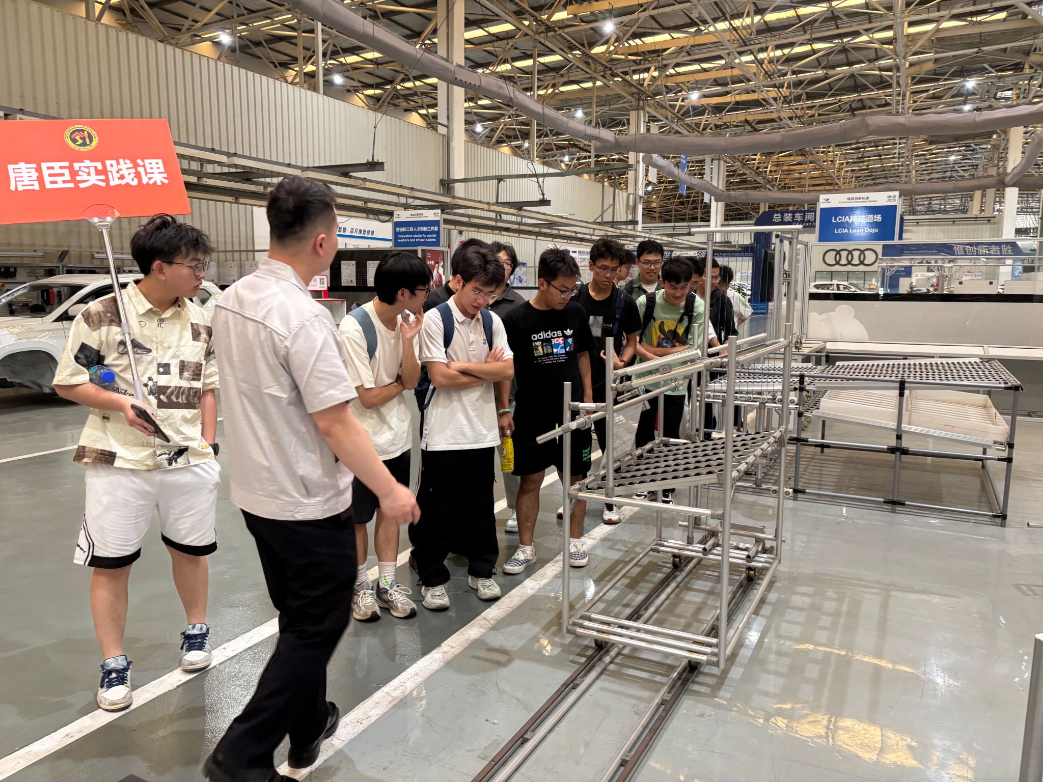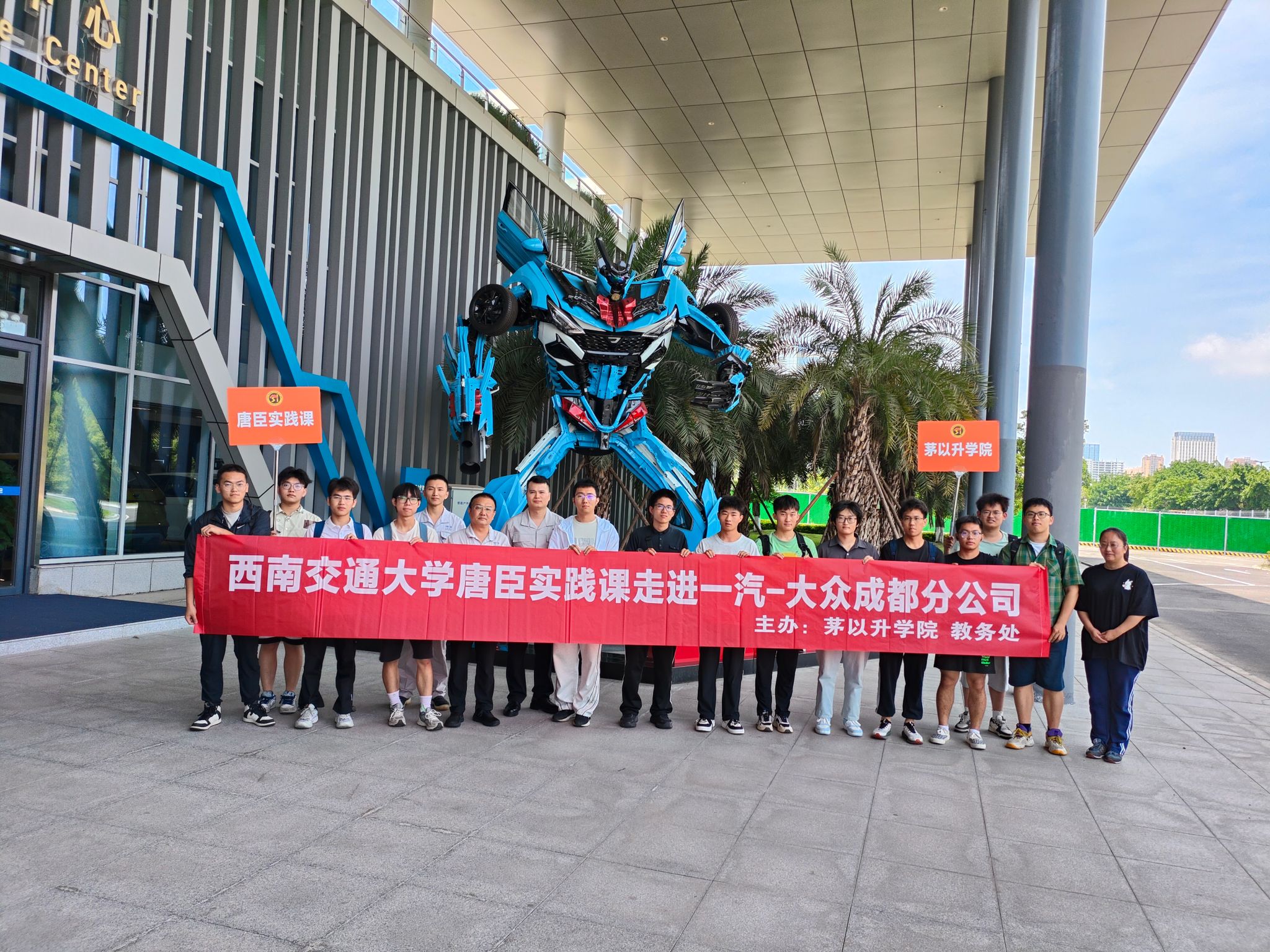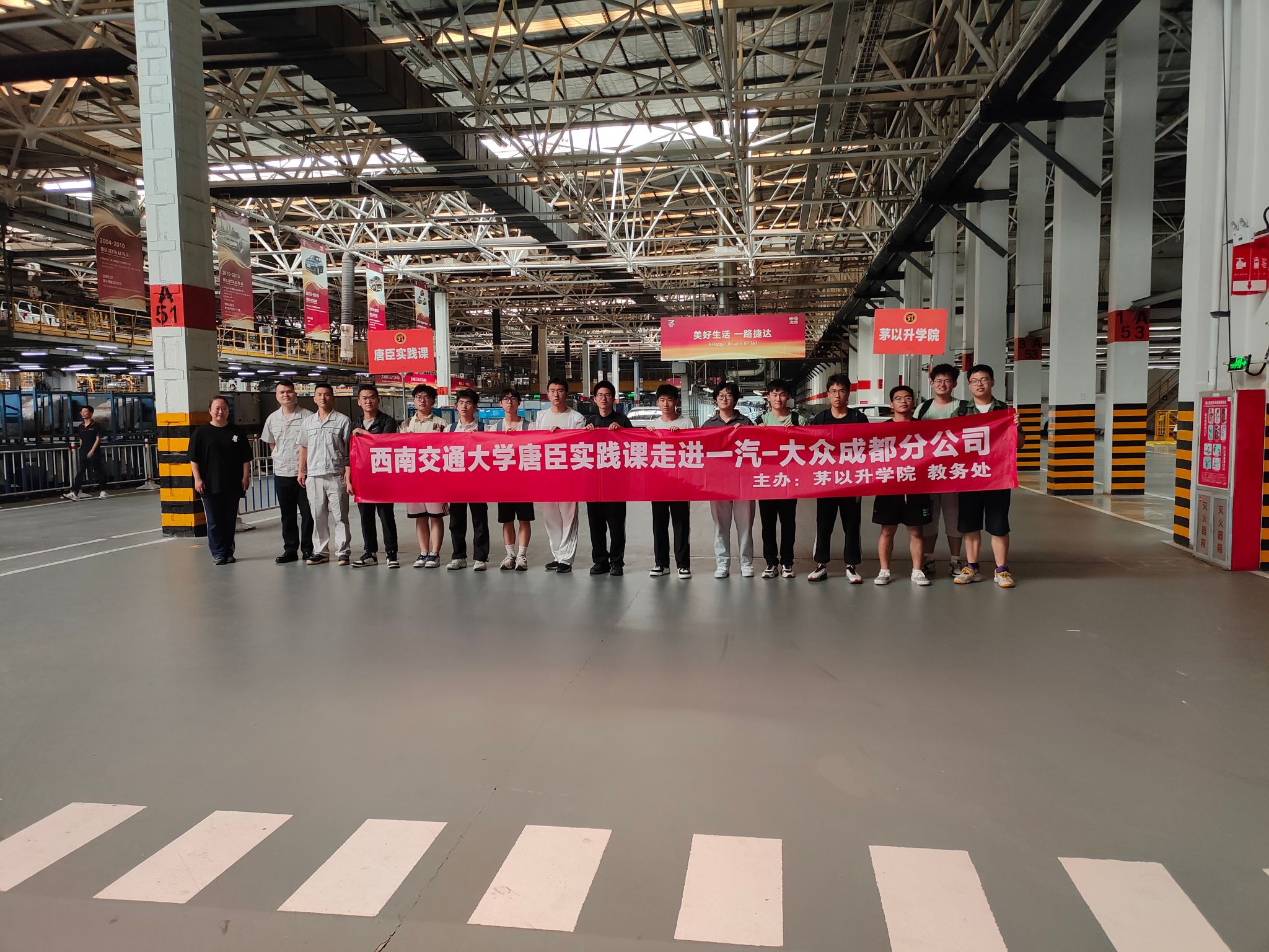 5月8日下午,唐臣实践课第六讲在一汽-大众成都分公司顺利开讲。本次唐臣实践课由av影片 、教务处主办,得到了一汽-大众成都分公司的大力支持。来自av影片 、智慧城市与交通学院共13名同学参加,大家共同深入感受现代化汽车工业的魅力。av影片 教学管理办公室主任王丹带队此次实践课。