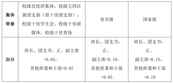 学生干部在任职期间,所带学院班级或组织获得以下荣誉,在原基础上加分(任职不满一年者此项不加分),加分时出具任职期间的集体荣誉证书:
