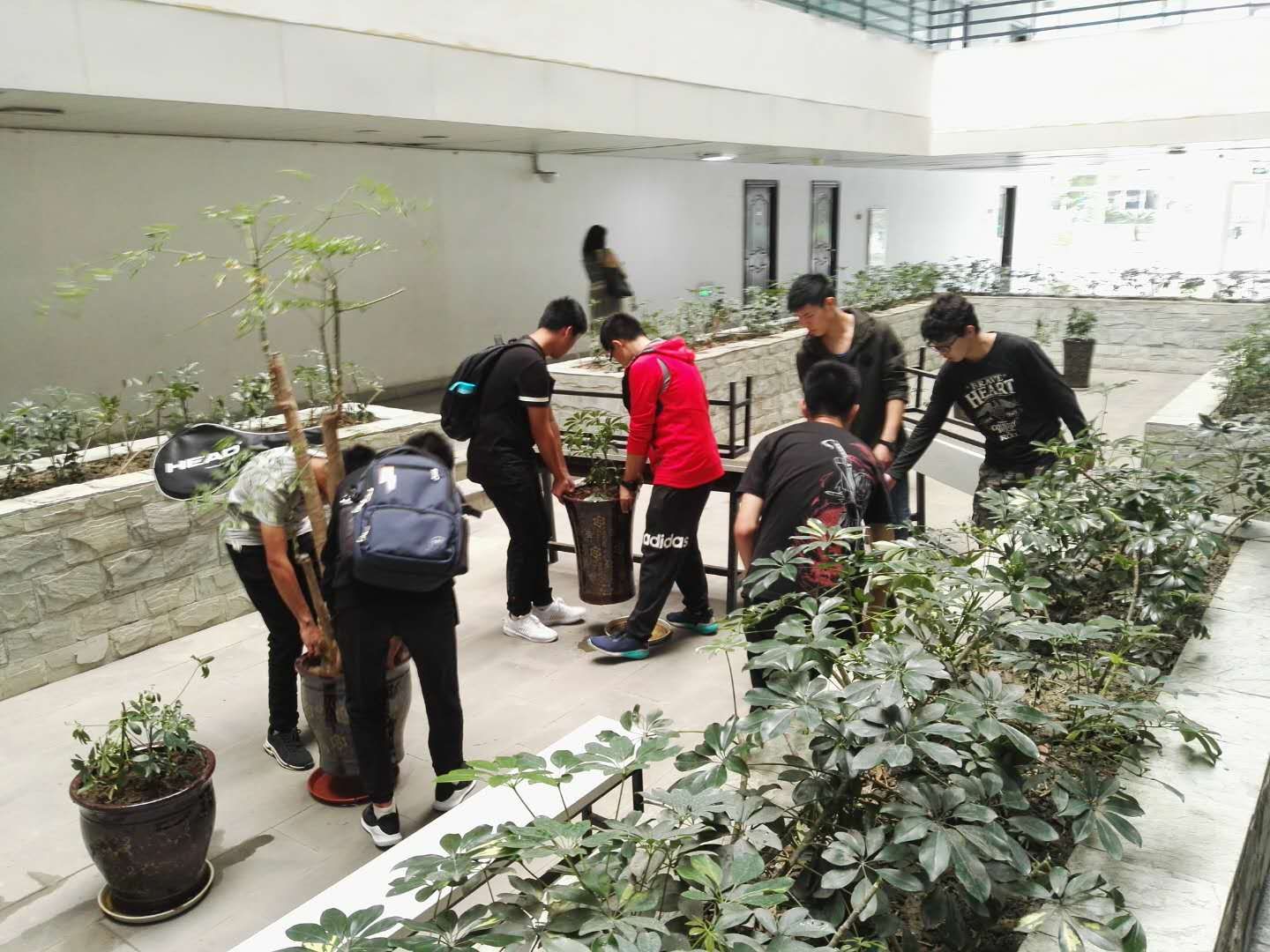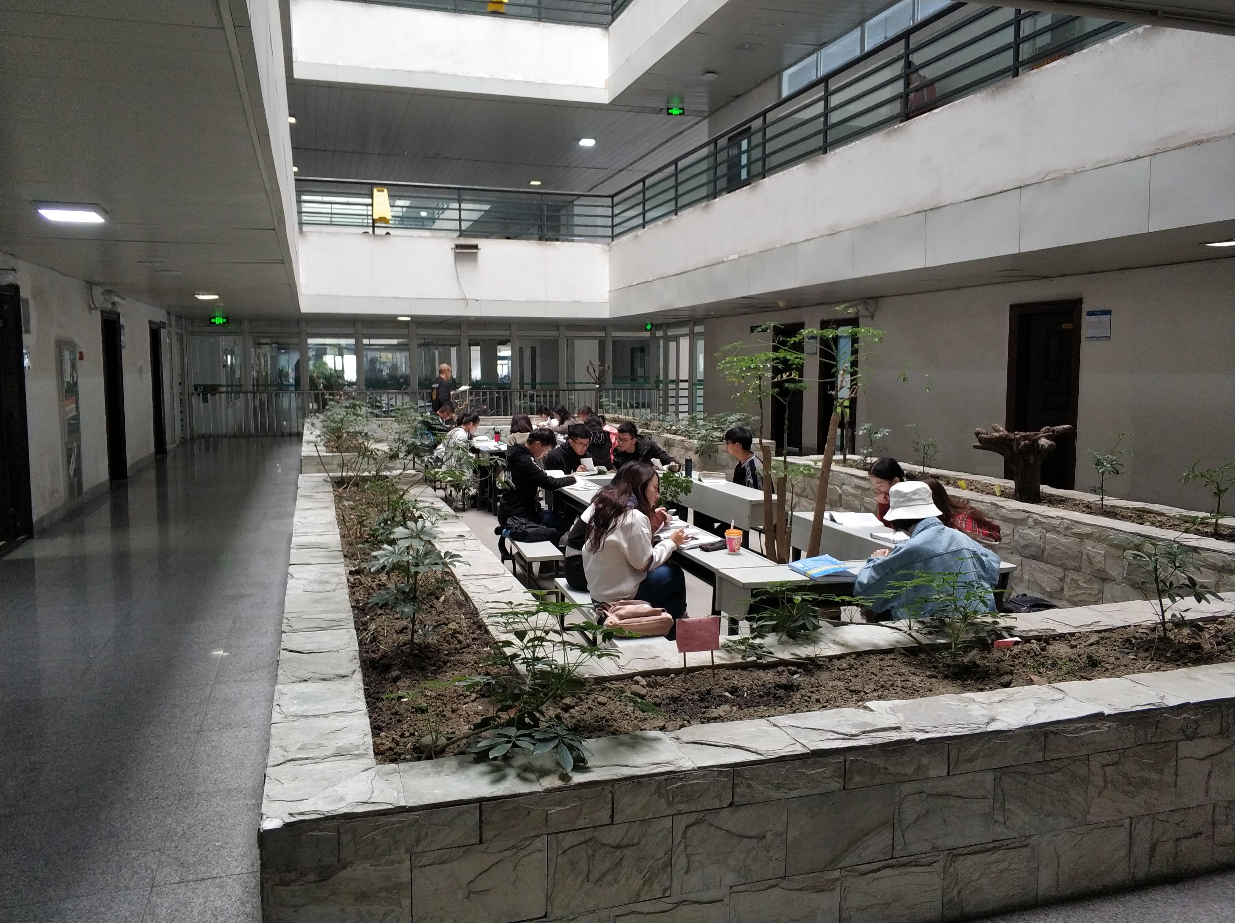 办公区,之前是以条状绿化带围成的下陷式开放的公共区域,甘霖书记经多次现场勘察和设计,计划将其打造成文化生态园,以各类植物、根雕、雕塑、桌椅和办公区两侧的文化墙构成师生学习交流、文化熏陶、课间休憩的公共园区,成为学院“文化育人”的重要平台。