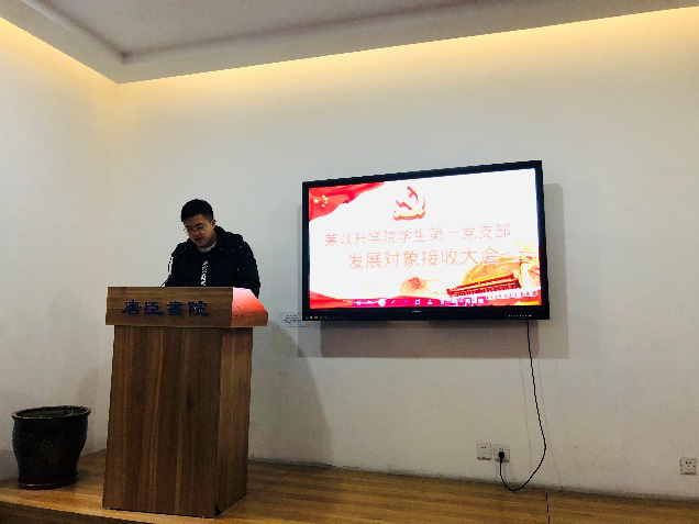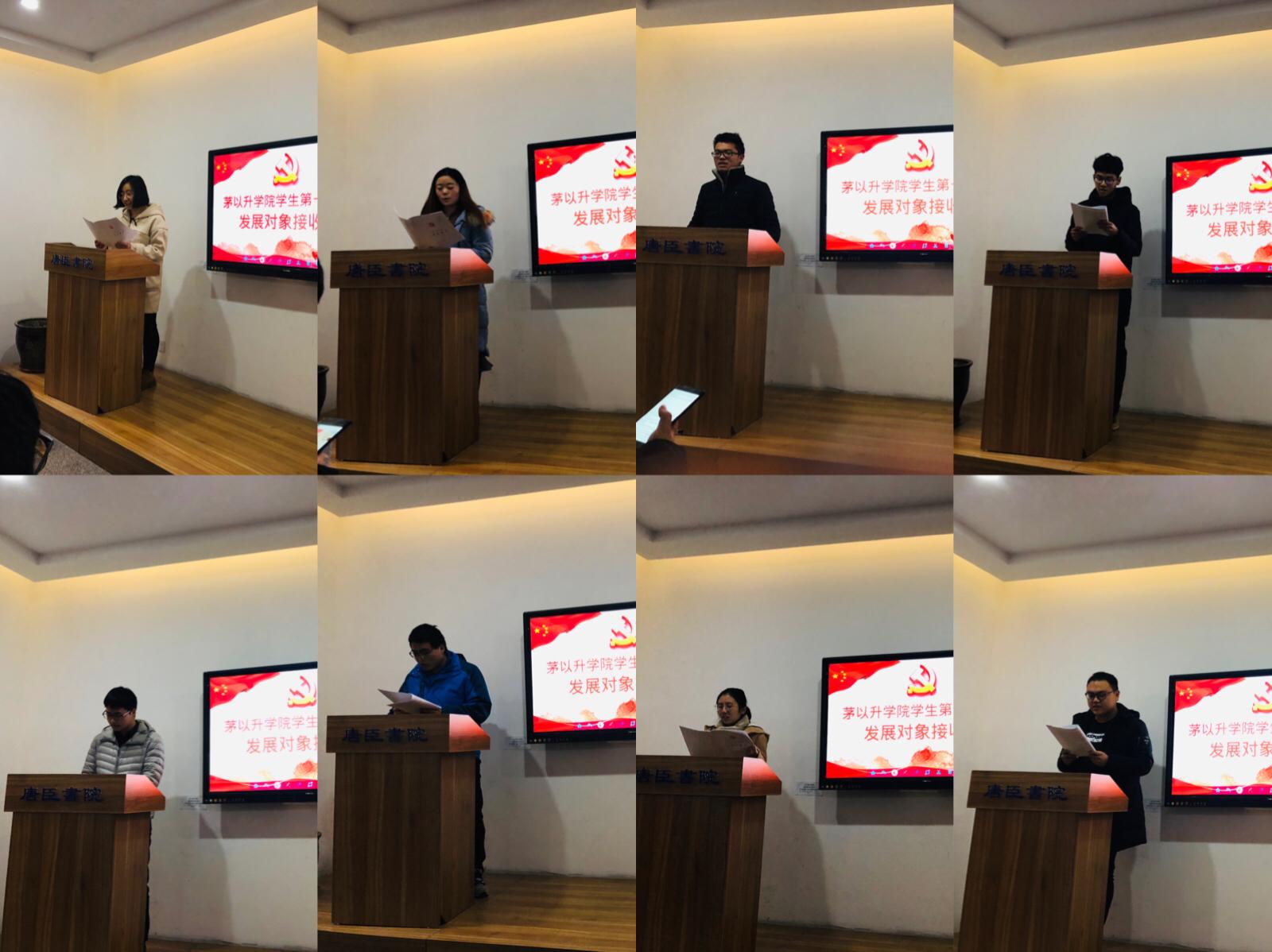 各位发展对象按张文娟、胡晓楠、徐延泽、李增辉、黄垠钦、赵含晓、周雅莹、靳鑫的顺序一一上台发言,大家均表达了自己对党组织的热爱,并向组织报告了这段时间在思想政治、学习工作等多个方面的情况,经大会党员决议,一致同意接收这些同志为中共预备党员的申请。