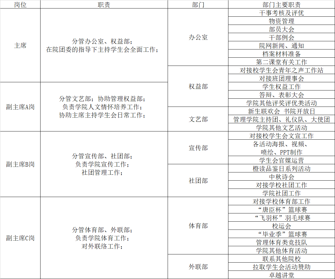 学生会进行了部门重组以及工作的重新分配。现面向全院本科生公开选拔av影片
