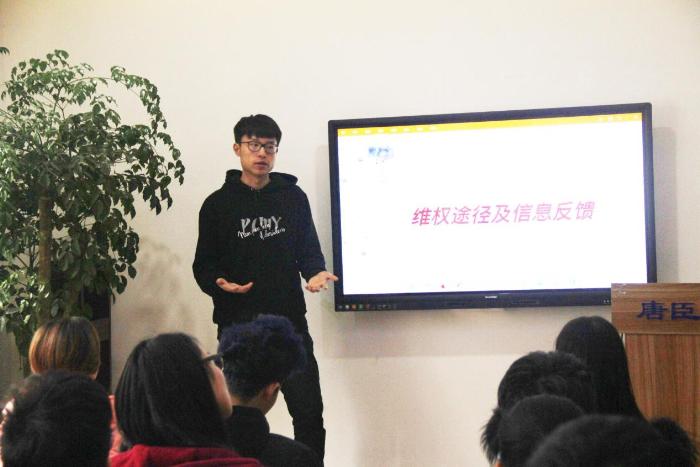 赵天胤首先简单介绍了维权工作。维权工作由校团委(学生会)、院团委、院学联理事会、院学生会、班委层层递进,共同配合开展;相关工作办法由学院党总支、学工组监督指导,院团委牵头学生会制订。学生会成立了由指导老师毛盾任组长,主席和分管宣传的副主席任常务副组长,相关责任部门部长任副组长,所有正部长和相关责任部门副部长任成员的工作小组,有细致而明确的分工。学生会开展此项工作,是不忘学生会成立的初衷——为同学服务、维护同学权益,履行学生会的主要职能的实际行动;也是响应共青团中央、全国学联号召,贯彻校团委改革方案的具体体现。此外,赵天胤还讲解了意见和建议收集整理后的处理方式以及具体的反馈方式。