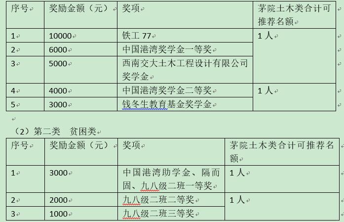 2)茅以升工程教育学生奖,2016级茅院土木班在读学生,共评选1人,5000元/人·年,报学校和奖项评审委员会评审,评审委员会第二年3月底公布评定结果: