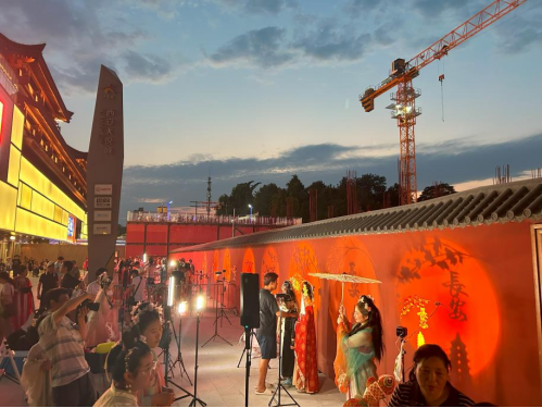 大唐不夜城熙熙攘攘。街上身着汉服的女子来来往往,映照在恢宏的红色建筑下,让我产生了错觉,仿佛自己身处大唐盛世而非现代,感受我大中华的魅力。