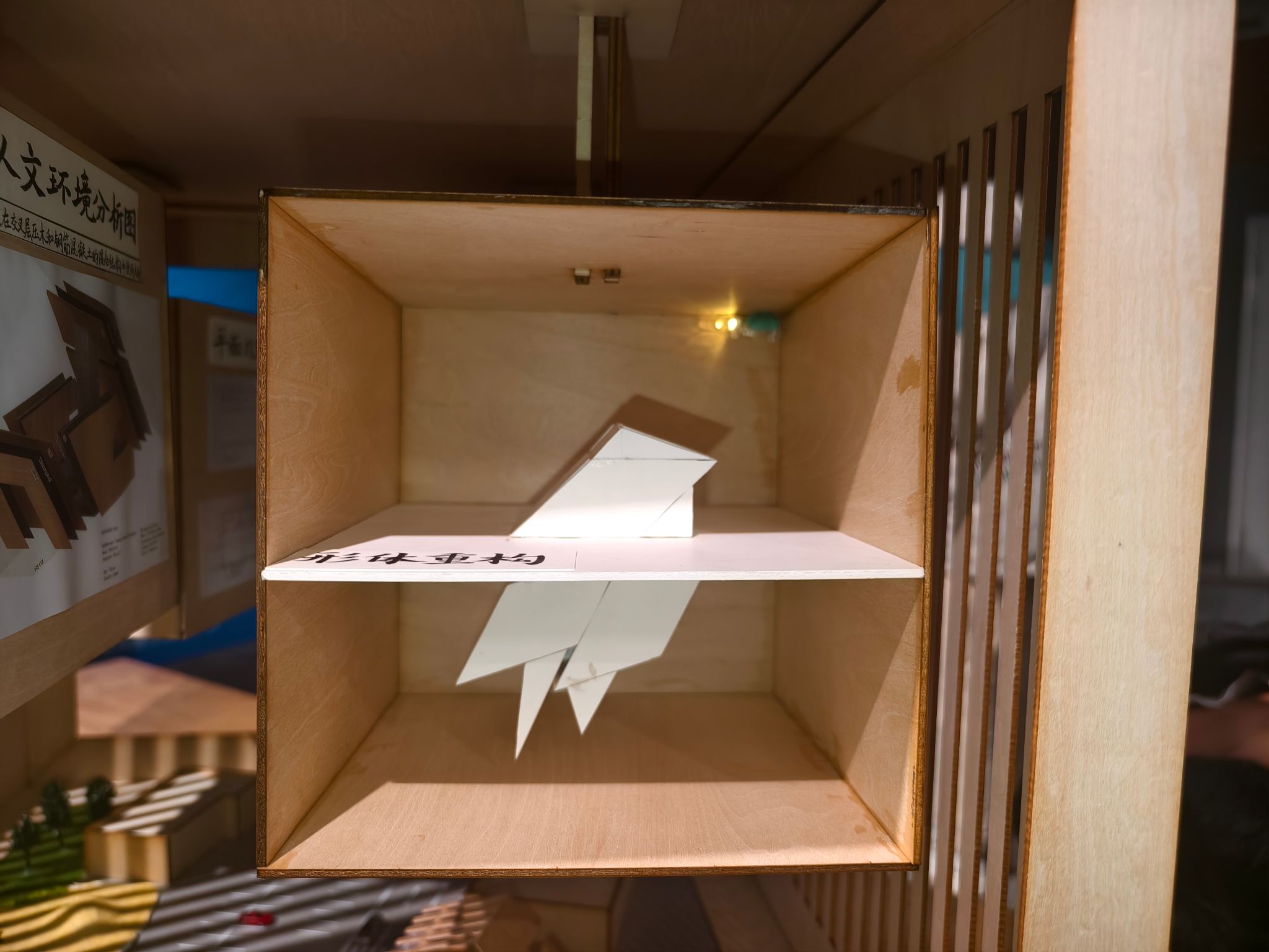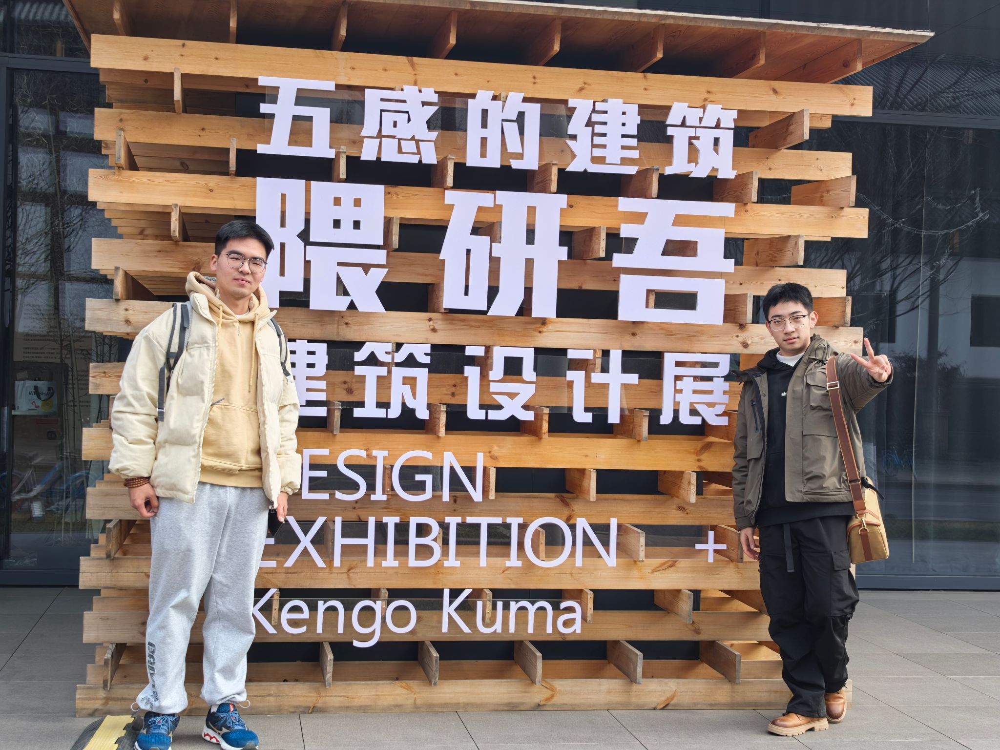 从经典案例模型和设计理念分析到现场强调的五感布展所带来的沉浸式体验,半小时的深入观展让我初步建构起了“理论-实践”的双向认知通道,课堂讲授的“模糊空间”概念在展览的茶室装置中具象化为竹帘筛落的光影剧场,教科书中的“材料叙事”理论在实木构件的肌理中娓娓道来……在观展中,专业知识便完成了从符号认知到具身认知的质变。这种跨越课堂内外的学习模式,恰似隈研吾建筑中“虚与实”的辩证关系——教室内提供理论骨架,而课堂外的体验赋予其血肉灵魂。