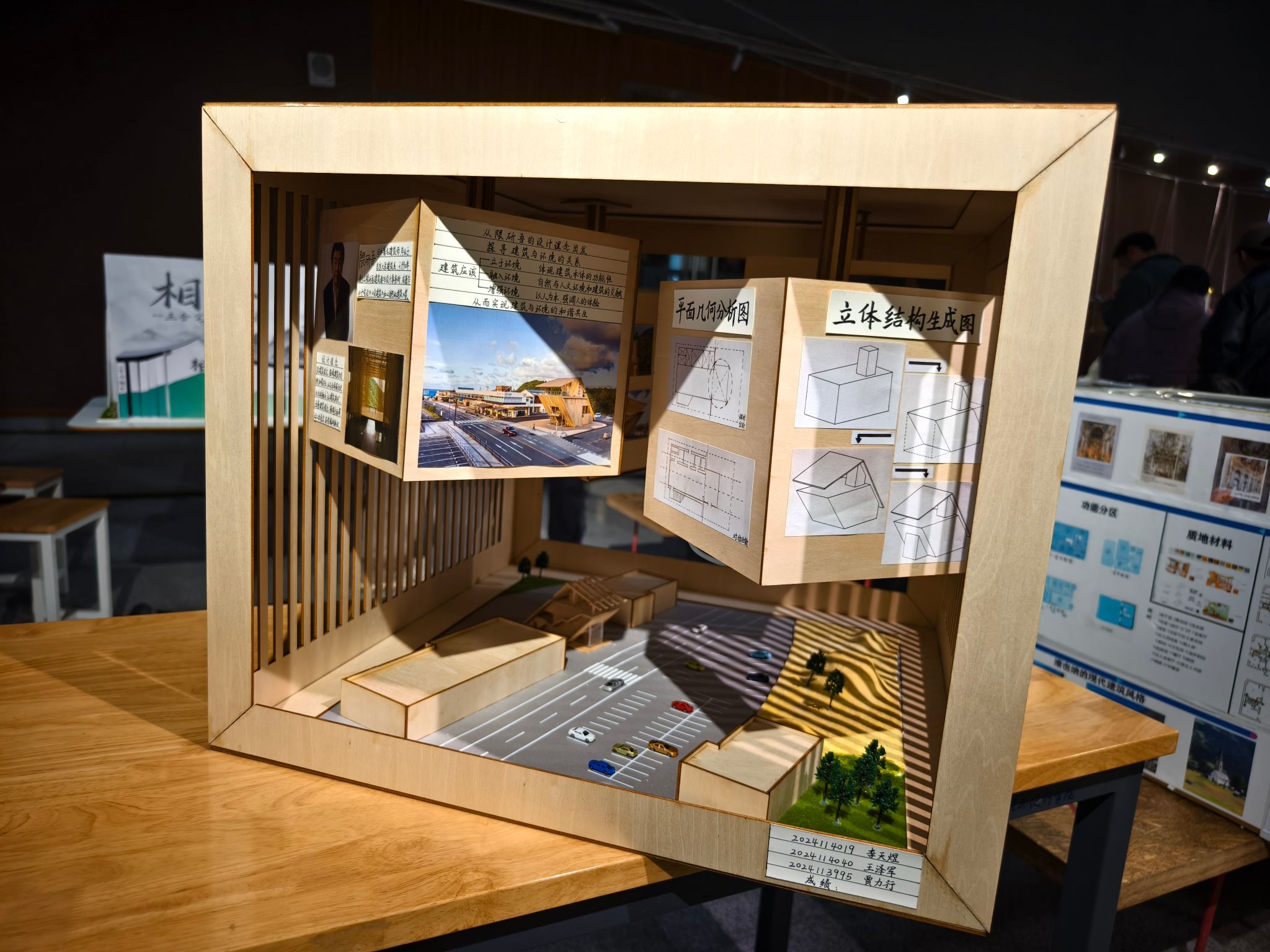这个看似寻常的滨海建筑,通过其独特的木构叠砌与光影游戏,完美诠释了东方建筑“消隐于自然”的哲学。然而,当我们试图在模型和图纸中还原设计逻辑时,却始终无法传达那种材料与空间的诗意对话。这份未尽的困惑,在偶然间化作寒假赴杭州探访隈研吾建筑展的先验,一颗课外由隈研吾为切入点,继续探寻建筑设计理念的种子悄然埋下······