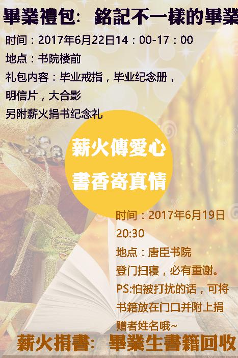 1.薪火捐书:请13级所有同学在指定时间内前往唐臣书院,在现场活动负责人的引导下领取捐书证以及捐书礼品。