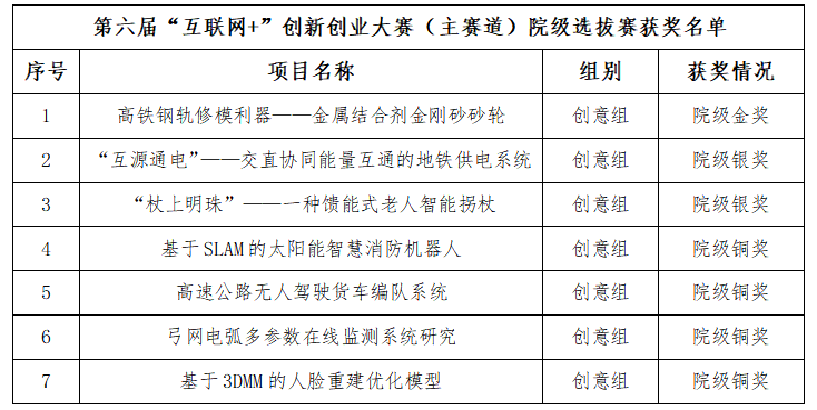 第六届“互联网+”创新创业大赛院级选拔赛获奖名单公示做如下公示: