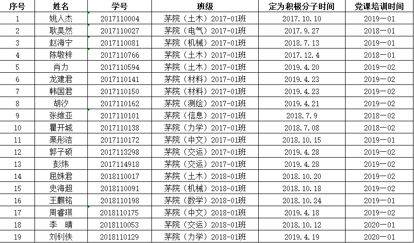 为进一步提高党员发展质量,切实做好党员发展对象的培养教育,av影片 严格按照校党委要求,在学院党总支的领导下,经培养考察、民主推荐、党支部讨论确定,拟将姚人杰等19位同学确定为2020-02期发展对象,参加党校培训。为增强党员发展工作的民主程度和透明度,广泛接受群众监督,保证党员发展的质量,特公示如下:
