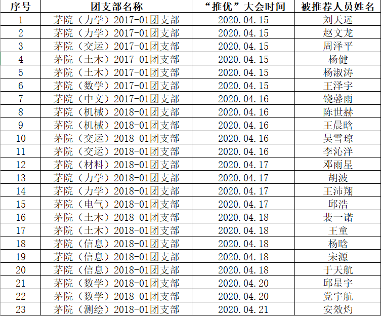 共青团组织积极向党组织推荐优秀团员青年作入党积极分子是“党建带团建,团建促党建”工作的重要切入点,是党对共青团提出的具体要求,也是共青团作为党的助手和后备军的具体体现。为使“推优”工作规范化、透明化、公开化,特将2020-01期“推优”名单公示如下: