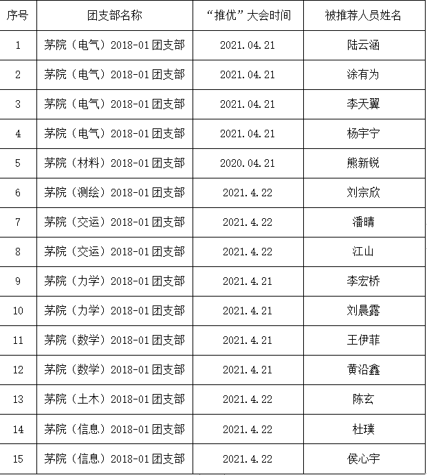 共青团组织积极向党组织推荐优秀团员青年作入党积极分子是“党建带团建,团建促党建”工作的重要切入点,是党对共青团提出的具体要求,也是共青团作为党的助手和后备军的具体体现。为使“推优”工作规范化、透明化、公开化,特将2021-01期“推优”名单公示如下: