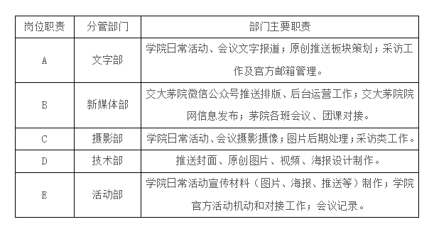 3.专业不限,有半年及以上校院级传媒组织工作经历、擅长摄影、图文编辑或视频和海报制作者优先。