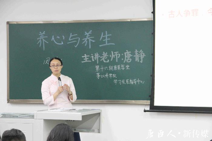 心理研究与咨询中心的唐静老师。唐静老师学医出身,并有着丰富的心理研究工作经验,对养心与养生有着深刻的见解。本次讲堂旨在使同学们认识到养心与养生的密切关系,增强对自我身心健康的关怀。