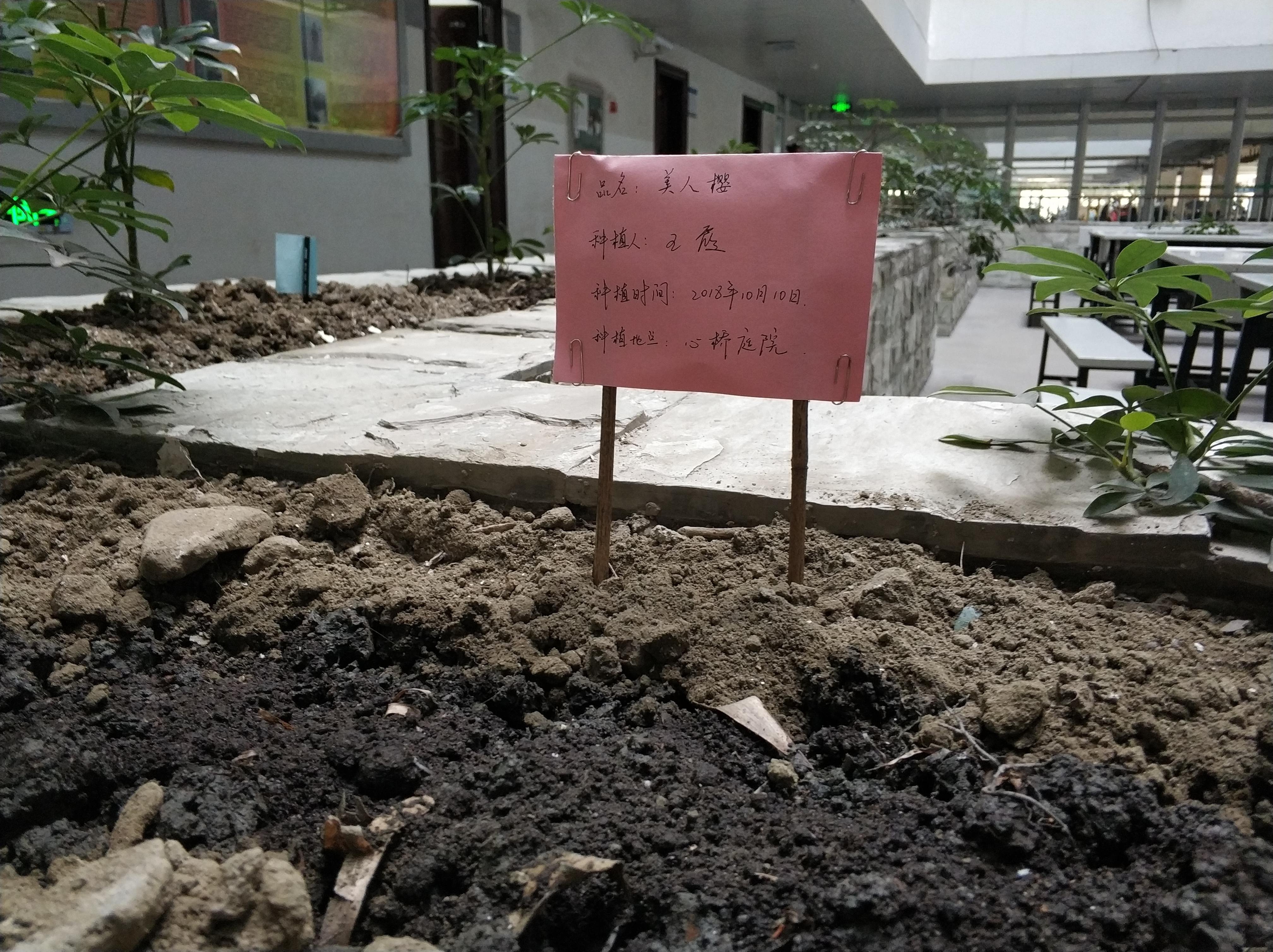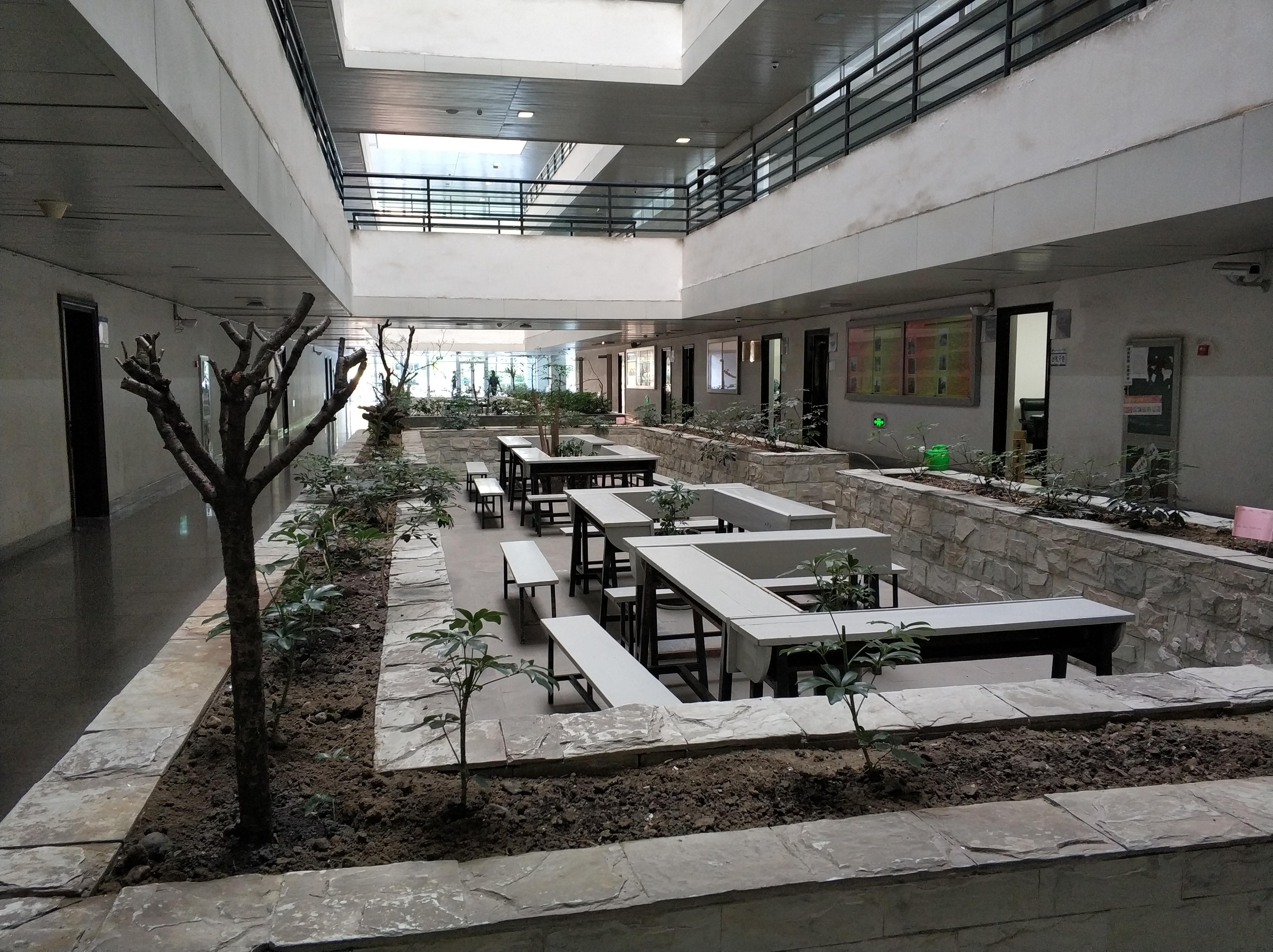 办公区,之前是以条状绿化带围成的下陷式开放的公共区域,甘霖书记经多次现场勘察和设计,计划将其打造成文化生态园,以各类植物、根雕、雕塑、桌椅和办公区两侧的文化墙构成师生学习交流、文化熏陶、课间休憩的公共园区,成为学院“文化育人”的重要平台。