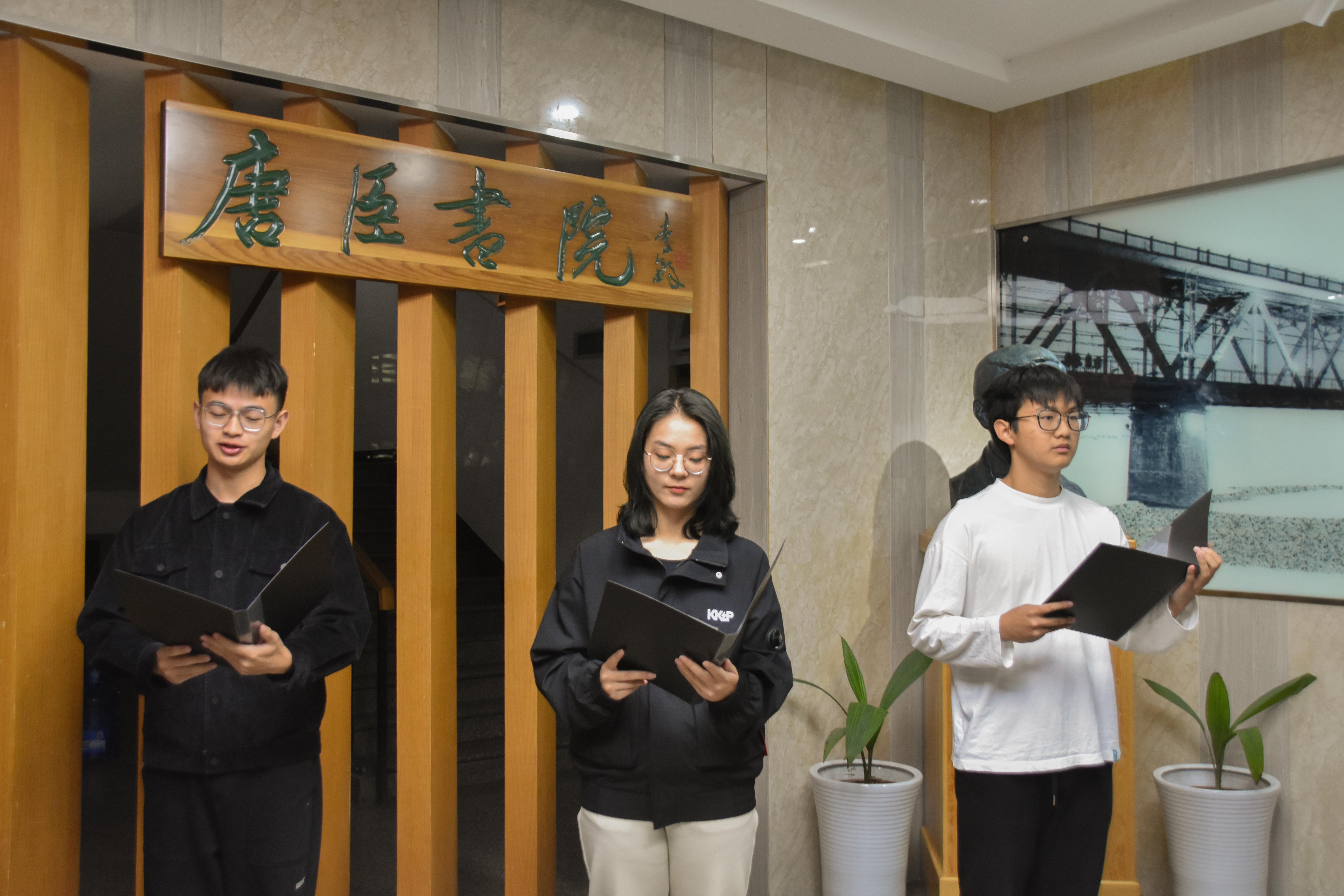易若皓,李宁欣,谢方兴同学以一则《唐臣青年》,歌咏唐臣担当。“眼前有一本厚重的书”,这书里是奋斗,是期望,也是顽强;“眼前有一架钢铁的桥”,这桥上有精神,有担当,也有方向;“眼前有一座高耸的山”,这山上有陌生,有梦想,也指引人们远航。唐臣青年,当常怀茅以升精神,追寻着这“奋斗的书”、“精神的桥”、“陌生的山”;唐臣青年,应担负起时代之责,“俯下身来用热爱的心去读书”,“挺起脊梁用光明的心去架桥”,“迈开步伐用勇敢的心去登攀”;唐臣青年,要挺起坚实的胸膛,“用炽热的生命释放出卓尔乐群的光芒”,“用博大的情怀升腾起中华复兴的力量”。声声朗诵饱含深情,思绪不断,全场掌声阵阵,气氛热烈。
