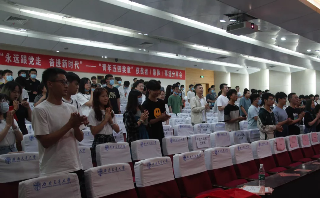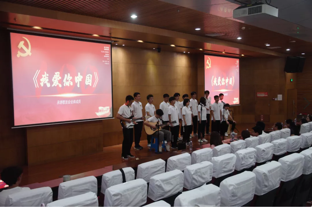 承唐歌友会的同学们为大家现场演唱了《我和我的祖国》、《国家》两首歌曲,在歌颂伟大祖国的歌声中,场下的观众也都渐渐融入了现场的气氛,用双手打着节奏跟着歌声吟唱起来。随着歌曲的结束,晚会进行到下一环节——对在“唱支好歌给党听”百个班级线上拉歌比赛中获得“十佳作品奖”的集体进行颁奖。