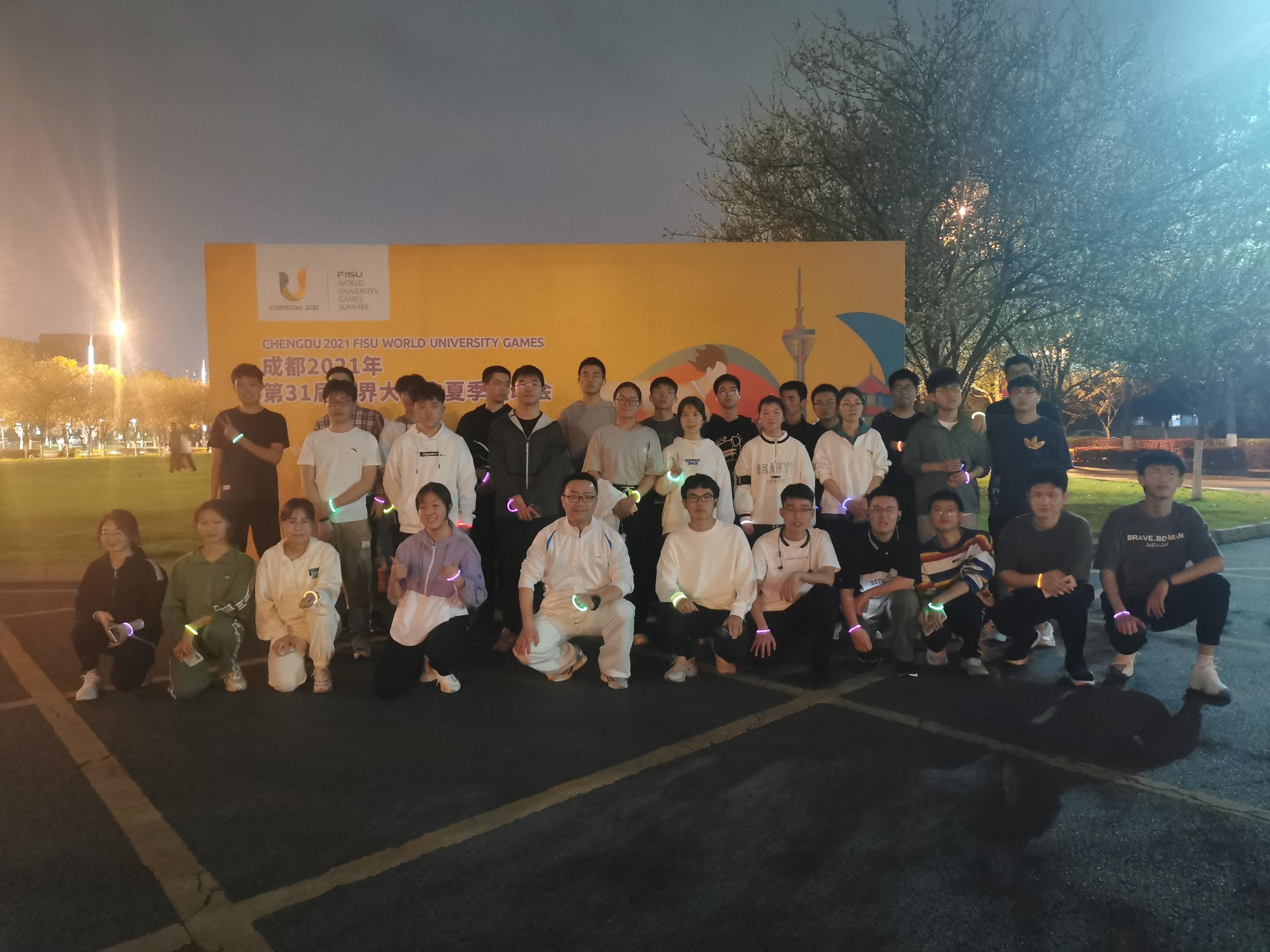 随后同学们戴好荧光手环,由领跑员带领同学们做热身运动,在甘霖书记的陪同下进行夜跑。夜跑开始,同学们排成一列纵队,从天佑斋21栋唐臣书院出发,途经综合楼,到达旗台。同学们在大运会宣传栏下合影,最后一起返回书院,全程共3公里。整个夜跑途中洋溢着同学们的欢声笑语,同学们相互帮衬,每个人都坚持着跑完了全程。而这个过程不仅锻炼了同学们坚韧的品性,还使同学们收获了宝贵的友情。在交大竢实扬华的大道上,茅院学子奔跑的姿态便是最靓丽的风景线。