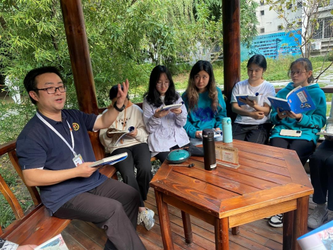 在竹林的苍绿之中遮掩着一座小亭,这方小亭之中,主讲人甘霖书记与同学们围坐成一圈,大家手捧《唐诗三百首》,耳听阵阵竹涛声。在这种亦师亦友的氛围之中,甘书记引导着同学们逐步体验吟诵文化,同学与同学,同学与老师之间都融洽而平和地互相交流与讨论。诗词往往由内而外地滋润着读书人的气韵与修养,恍惚之间,我们仿佛闻到了千年中华诗韵的芬芳,浮现了古代文人的雅集图景,也是如此这般老师与弟子们对坐于竹林之中,吟诵经典,品味国学。这就是中华优秀传统文化的真正传承,古代圣贤之诗文已润物无声地浸润着书院学子,令人久久回味、余音绕梁......