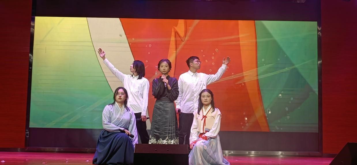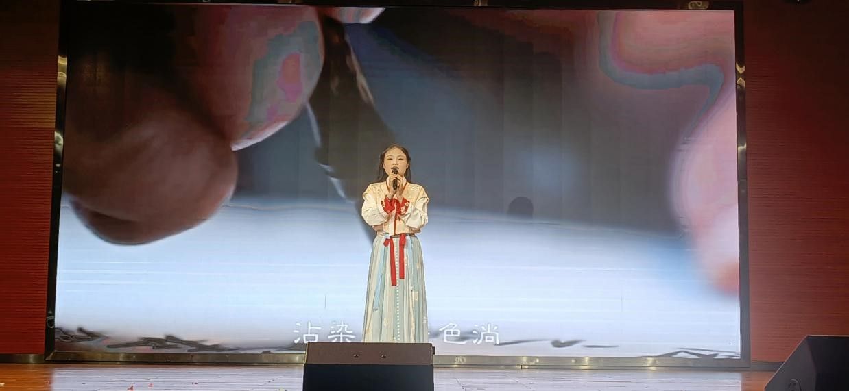 紧接着,由李羽彤、张誉航、李天意、杨廷晗、张靖晗、王冠雯六位同学带来的重唱歌曲《琵琶行》。这首歌的歌词取自最著名的中国古诗《琵琶行》,在改编成歌曲之后,用节奏欢快、旋律和谐的特点把古典音乐的精髓融入到了现代的复古音乐风格之中,给人带来新奇与乐趣。