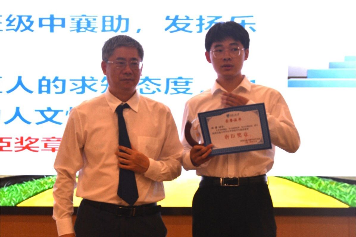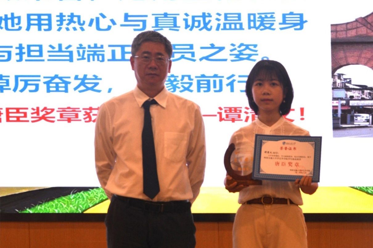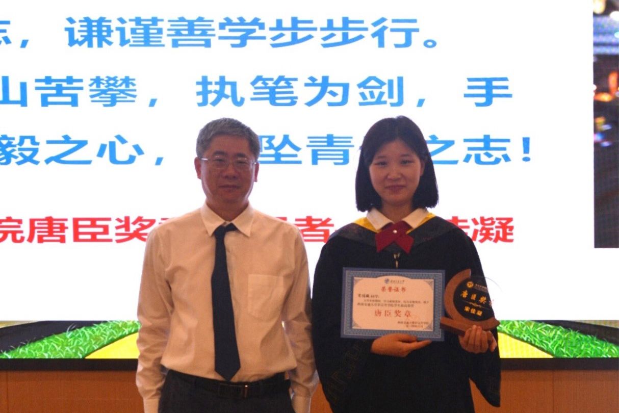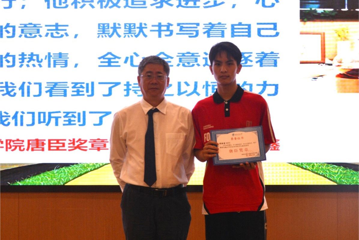 接下来,进入毕业荣誉典礼的表彰环节。校长助理、教务处处长、av影片 常务副院长崔凯宣读学院2024届学生最高荣誉“唐臣奖章”表彰文件,并由康国政院长对7位获得唐臣奖章的毕业生颁发奖杯及证书。