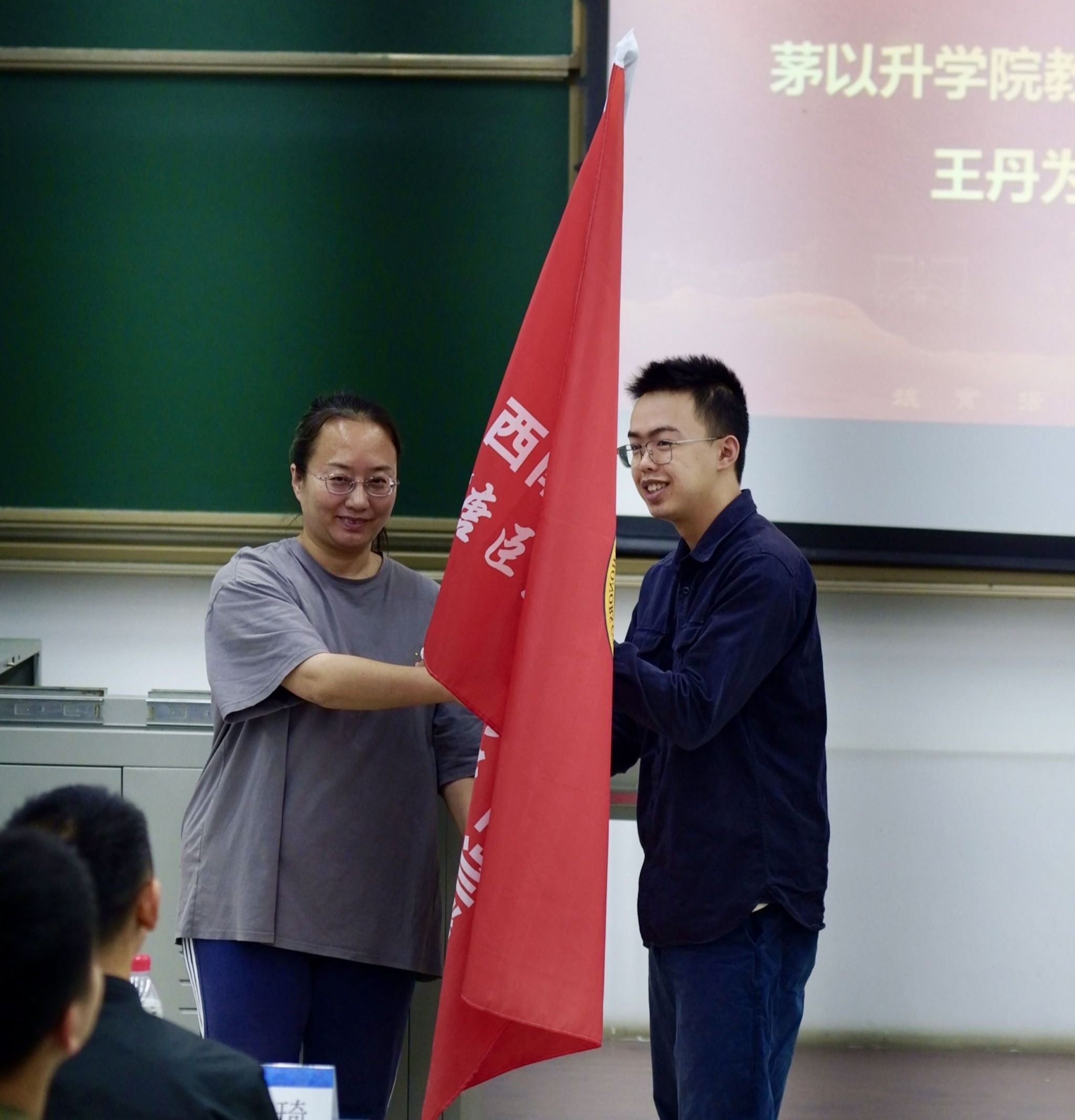 王丹为第一期训练营授旗,学生干部代表曾惟清同学接旗。这面旗帜不仅象征着训练营的荣誉和责任,更承载着av影片 对学员们的期望和信任。