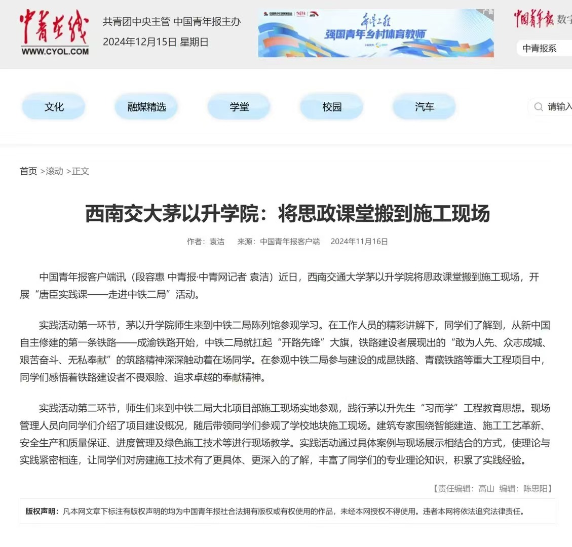 :将思政课堂搬到施工现场”为题,报道学院“唐臣实践课”建设情况。