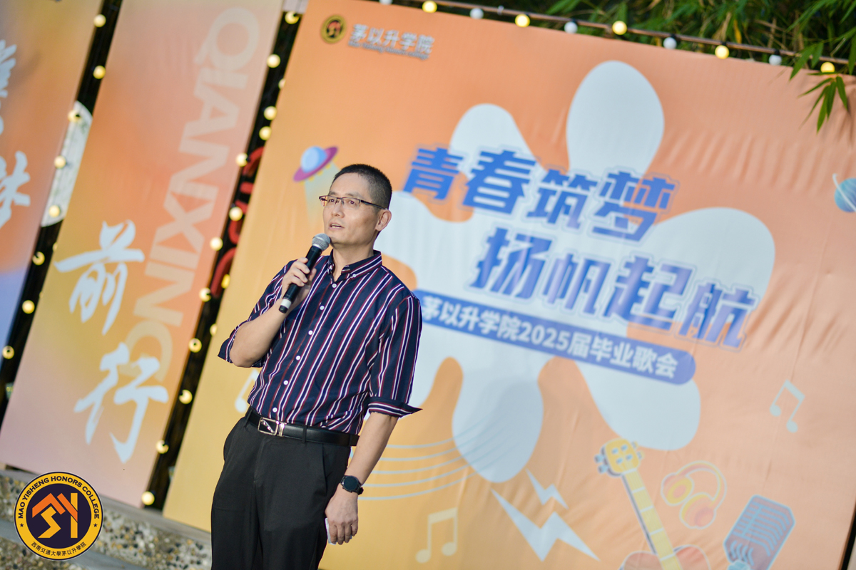 彩蛋环节,学院党总支书记李毅为大家带来一段深情告慰和衷心祝福,并带来一首《想和你去吹吹风》。他微哑的声线里氤氲着“风会带走一切短暂的轻松”的温柔劝慰,泪光与微笑在夏夜的晚风中交织成最动人的毕业礼物。