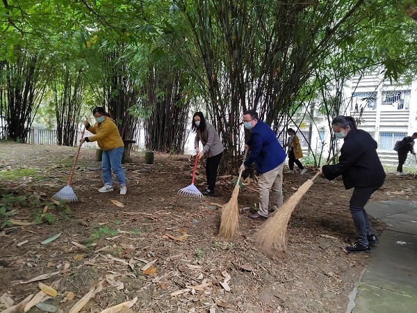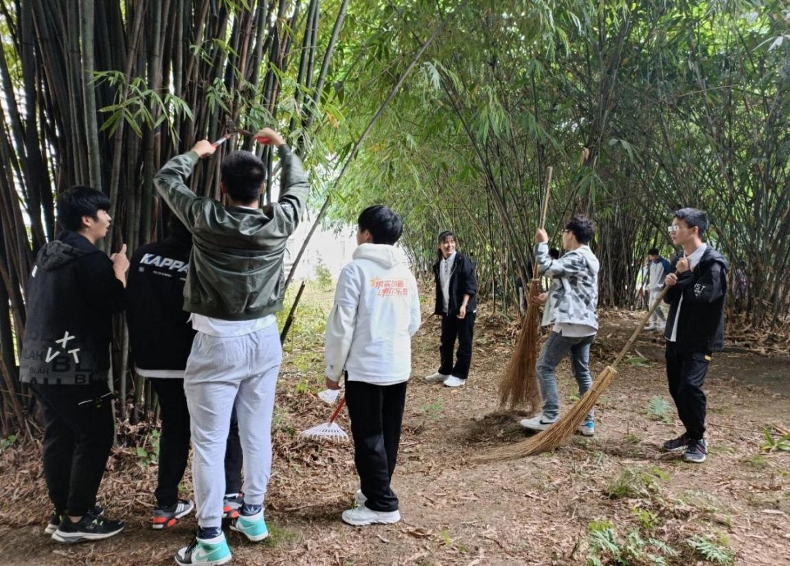 授牌仪式后,在校团委张军琪书记和学院甘霖书记的带领下,老师和同学们前往筑梦园开展“筑梦劳动体验季”主题党日活动。同学们在老师的带领下,松土填坑、修枝剪叶、扫落叶、运垃圾,师生们各司其职,团结协作,基本完成了清理、修剪与翻土的工作。