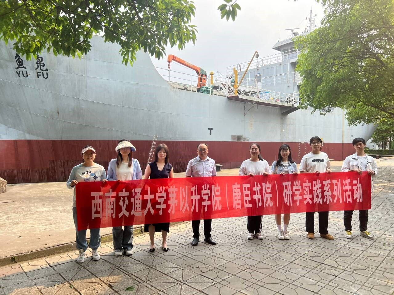 随后,我们来到船舶科普基地“鱼凫号”海船进行参观。“鱼凫号”不仅是四川交通职业技术学院的标志性景点,同时也是该校航运工程系航海技术、轮机工程技术以及国际邮轮乘务三个专业为一体的钢结构多功能教学实训船。师生还了解了“鱼凫号”海船功能、船舶结构等内容。
