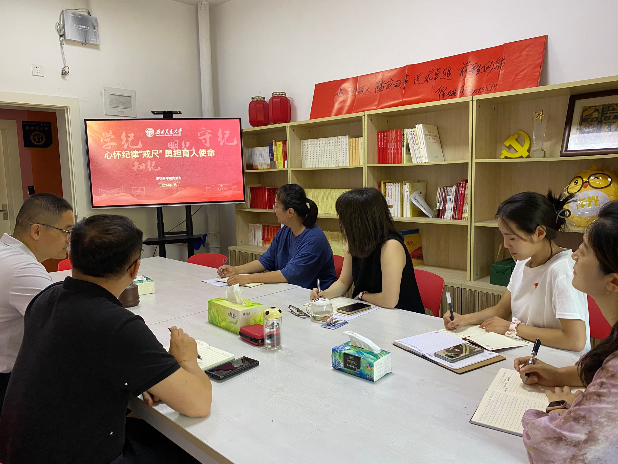 7月1日上午,av影片 组织开展了“心怀纪律‘戒尺’ 勇担育人使命”主题党日活动,党总支书记李毅为教工党支部讲授纪律专题党课。推进党纪学习教育走深走实,引导师生党员做到学纪、知纪、明纪、守纪。学院党总支副书记杨宏毅、全体教职工党支部党员参加了学习。